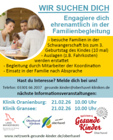 Das Netzwerk Gesunde Kinder Oberhavel ist wieder auf der Suche nach ehrenamtlichen Familienpatinnen und -paten. Am 21. Februar 26 finden um 10.00 Uhr an den Standorten Oranienburg sowie Gransee unsere nächsten Informationsveranstaltungen statt. Es werden bei dieser Veranstaltung die Struktur des Netzwerkes sowie die Aufgaben der ehrenamtlichen Tätigkeit genauer erläutert.