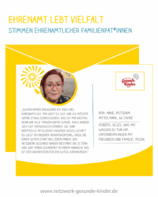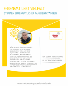 „Schon immer engagiere ich mich viel ehrenamtlich. Mir geht es gut und ich möchte gerne etwas zurückgeben, das ist mir wichtig. Denn wir alle tragen dafür Sorge, dass Kinder sich gut entwickeln können. Sie sind wertvolle Mitglieder unserer Gesellschaft. Es liegt in unserer Verantwortung, dass sie einen guten Start ins Leben haben. Das Netzwerk Gesunde Kinder bestärkt die Eltern und gibt ihnen Sicherheit in ihrem Handeln. Das ist der Grundstein für ein gutes Aufwachsen.“
