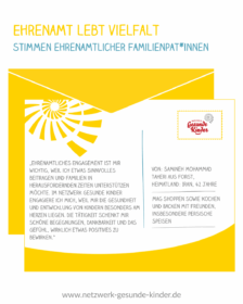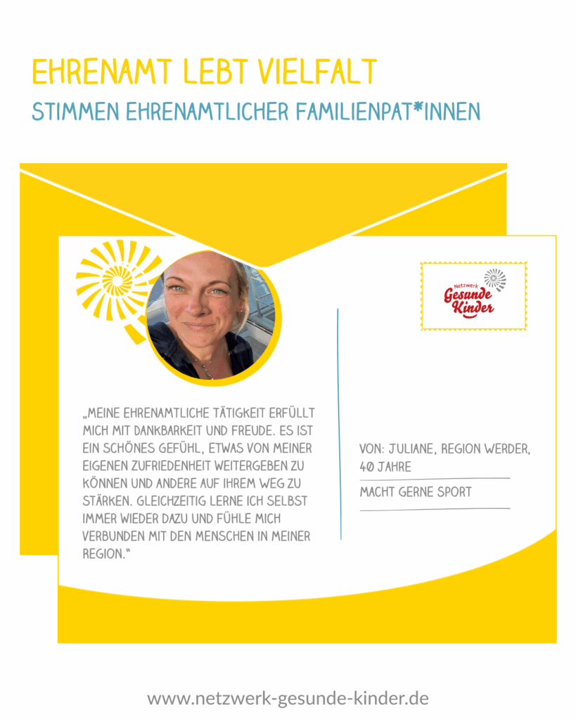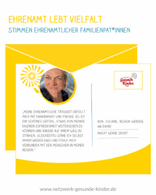 „Ehrenamtliches Engagement ist mir wichtig, weil ich etwas Sinnvolles beitragen und Familien in herausfordernden Zeiten unterstützen möchte. Im Netzwerk Gesunde Kinder engagiere ich mich, weil mir die Gesundheit und Entwicklung von Kindern besonders am Herzen liegen. Die Tätigkeit schenkt mir schöne Begegnungen, Dankbarkeit und das Gefühl, wirklich etwas Positives zu bewirken.“